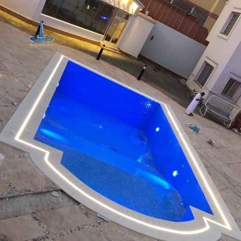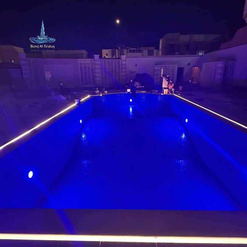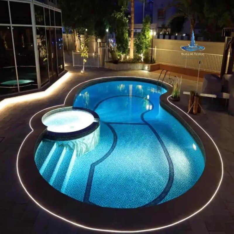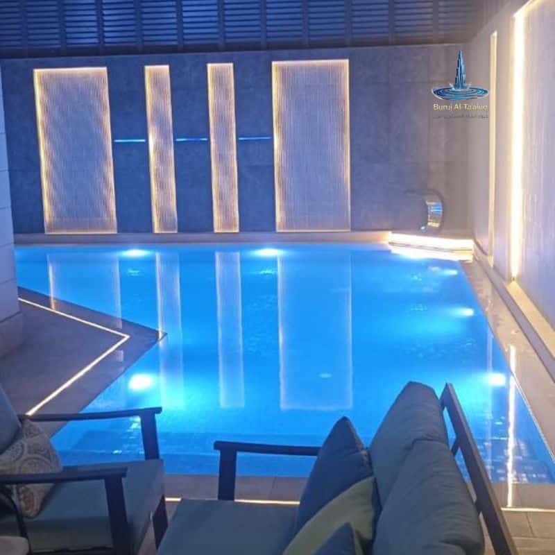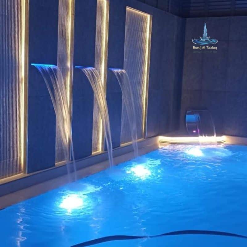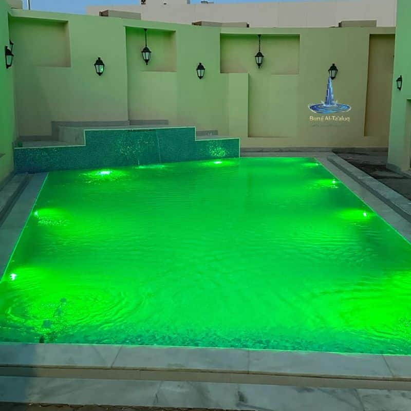 - الإضاءة الذكية (LED): تركيب إضاءات موفرة للطاقة تعمل تحت الماء وتتحكم في ألوانها لتعطي أجواء مميزة ليلية.