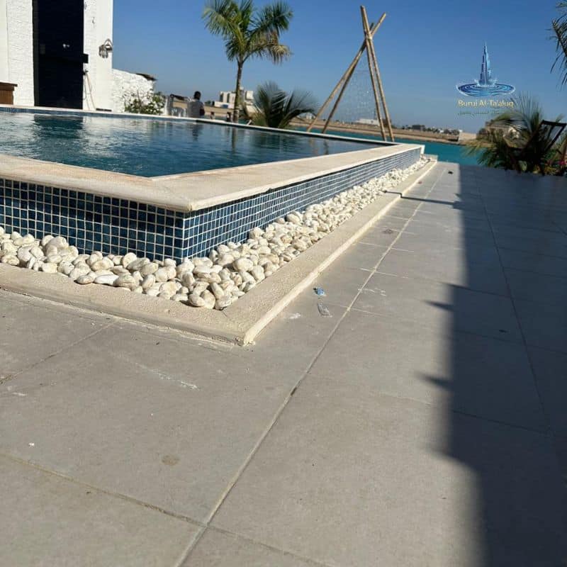 تركيب بلاط المسابح (موزاييك إسباني أو زجاجي)، وتركيب حواف المسبح (Grating/Coping) بلمسات فنية تضفي فخامة للمكان.